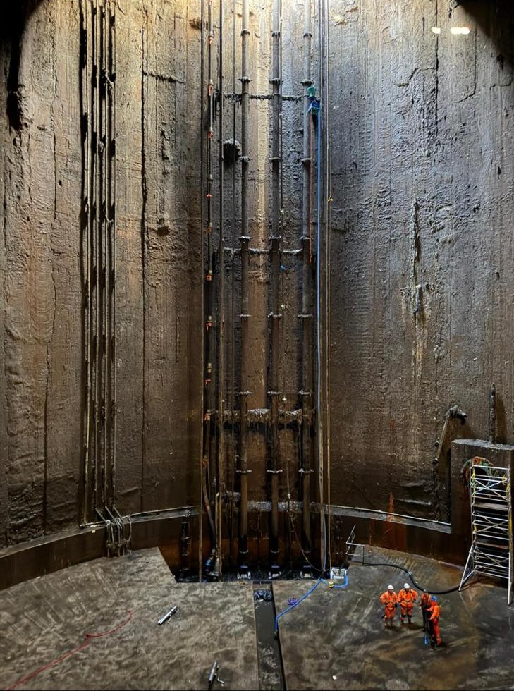 Because the tanks are 40m deep and 36m wide, cranes are used to lower all the equipment and people in and out. Mini diggers are used to scoop the sandy material into skips, and these are lifted out when they’re full.